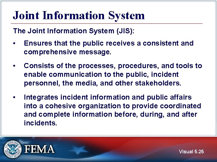 Joint information system is. The Joint Information System JIS interconnected to the other NIMS Command and Coordination structures bu it provides consistent coordinated accurate accessibletimely and complete information to the public and stakeholders during incident operations. The mission of the joint information system is to provide a structure and system for developing and delivering coordinated interagency messages. The Joint Information Center JIC provides the mechanism for integrating public information activities among the Joint Information Systems JISs.