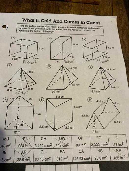 Some of the worksheets for this concept are Everyday math skills workbooks series Unniit 55 siinnsuullaattiioonn Poison dart frogs Practice tests and answer keys diagnostic test A silent killer carbon monoxide poisoning Activity 11 level 1 Pizzazz book d Food safety plan haccp. Find the surface area of each figure. What Is Cold And Comes In Cans Riddle Worksheets - total of 6 printable worksheets available for this concept. 40 mm 14 m. Blood worksheet answer key. 20 m 25 m 82 cm 64 cm 4 ln. What Is Cold And Comes In Cans Showing top 8 worksheets in the category - What Is Cold And Comes In Cans. 2zq 20S 11 in. Worksheets are This is a preview of the math riddle the work Pizzazz book d Punchline math pdf Middle school math with pizzazz book d 65 answers Activity pack for key stages 2 3 Putting out fires.
